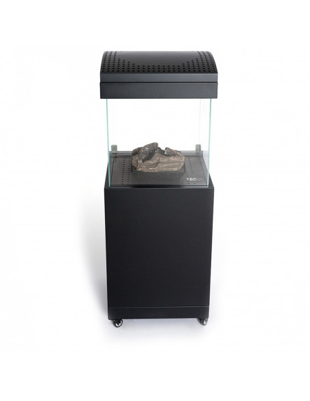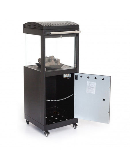 Ruedas incorporadas, antivuelco mecánico. Troncos cerámicos incluidos. Tipo de encendido: piezoeléctrico con regulación de potencia. Tipo de combustible: gas propano. Superfície recomendada: 20m2. Potencia: 8,5kw. Consumo combustible: 0,6kg/h. Autonomía mínima (duración bombona de gas): 16horas. Peso neto (sin bombona): 57,0kg. Dimensiones: 550x550x1320mm.