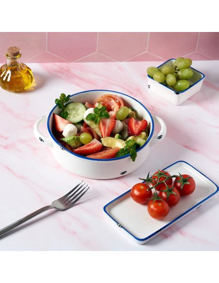 ALACENA AZUL es una colección muy particular y original. Realizada en porcelana de color blanco marfil con detalles en azul, evoca las antiguas vajillas de hierro esmaltado, reproduciendo incluso los característicos desportillados que aparecían con el uso cuando el esmalte se golpeaba y se iba desgastando.