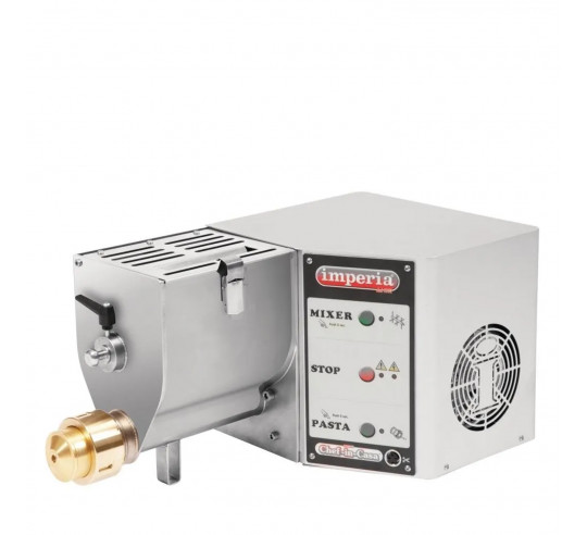 La máquina está dotada de molde para hoja de 170 mm. de ancho, y de cuchillo corta-pasta giratorio manual para las pastas cortas. También lleva una línea completa de accesorios (que se pueden comprar por separado).