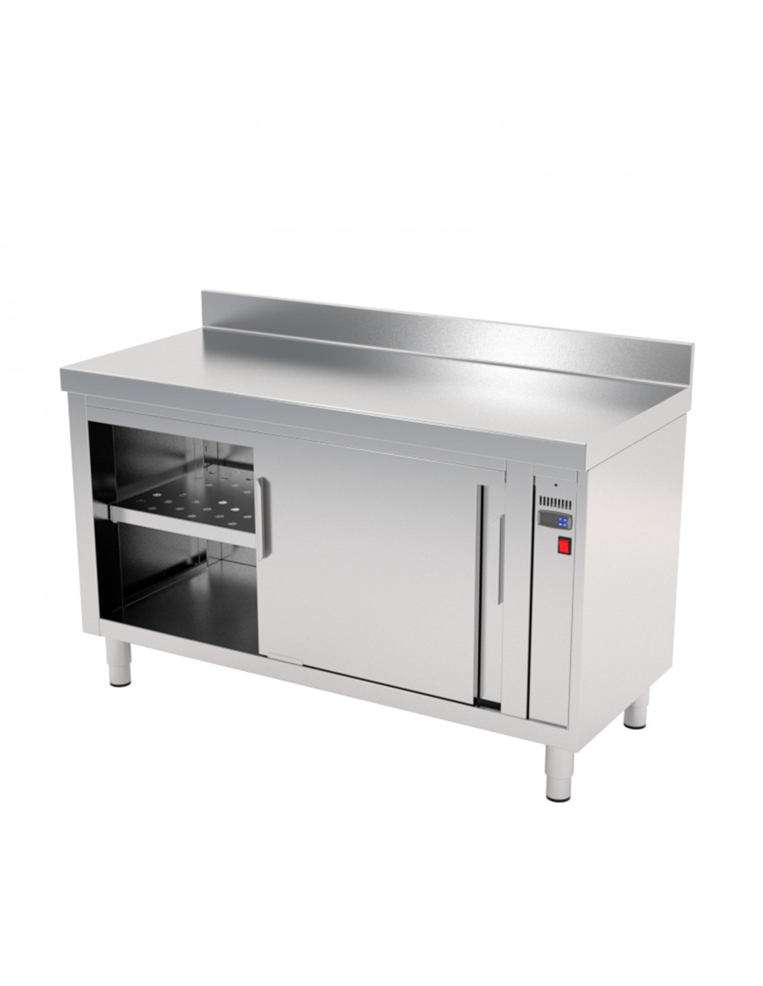 Construidas en Acero Inoxidable AISI 304 18/10 satinado y reforzados, excepto omegas. Frontal soldado de 60mm en punto redondo. Peto posterior soldado de 100mm con radio sanitario. Aislados con lana de roca. Bloque calórico lateral con resistencias ventiladas. Interruptor ON/OFF luminosos y termostato digital 0º-90º. Pata cilíndrica de acero inoxidable 150mm regulable 50mm. Puertas correderas a 1 cara aisladas, rodamientos superiores de nylon. Estante base con doble omega de refuerzo, estante intermedio regulable perforado.