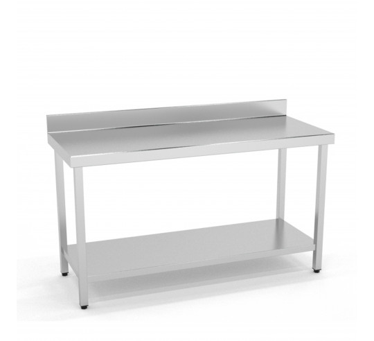 Construidas en Acero Inoxidable AISI 304 18/10 satinado y reforzadas con omega. Frontal soldado de 60mm en punto redondo. Peto posterior soldado de 100mm con radio sanitario. Patas de tubo 40x40 con taco regulable de 60mm. Estante reforzado con omega central. 6 patas a partir de 2000mm.