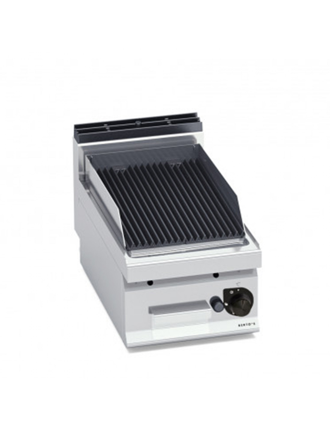 Parrilla de cocción redondeada en acero inox, con amplias ranuras para la recogida de grasas.